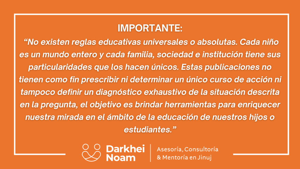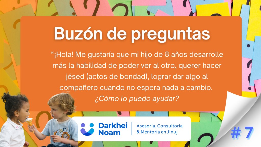 ¡Hola! Me gustaría que mi hijo de 8 años desarrolle más la habilidad de poder ver al otro, querer hacer jésed (actos de bondad), lograr dar algo al compañero cuando no espera nada a cambio. Por un lado, es pequeño aún, por lo que no espero un ingenuo sentimiento del ietzer hatov (su buena inclinación) a buscar el bien desinteresado, pero sí querría ayudarlo a educarse por ese camino.